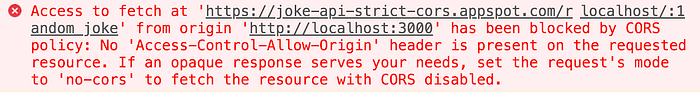 Here’s some quick Node.js code that uses the express web framework to create a proxy server around the same https://joke-api-strict-cors.appspot.com/ from above: